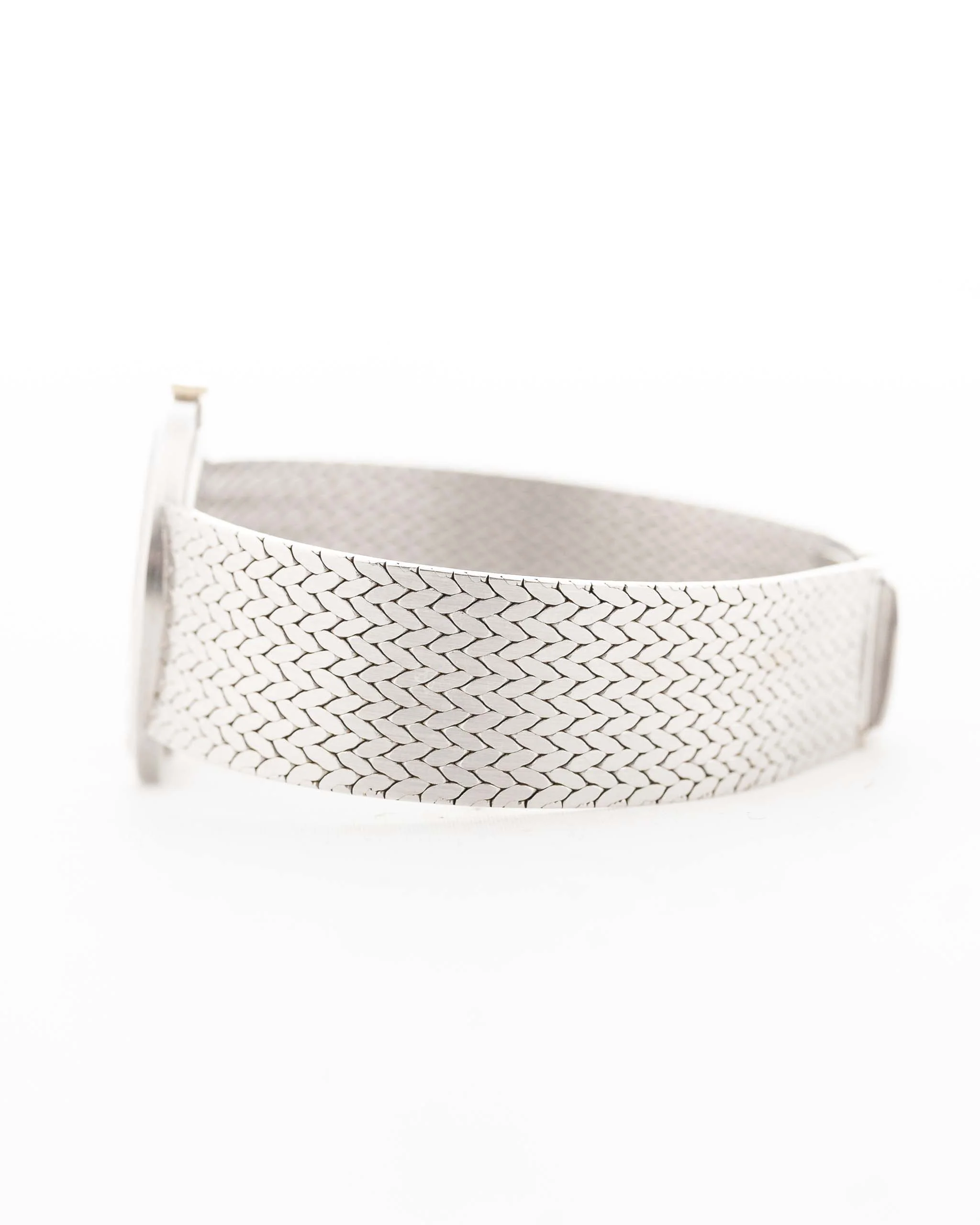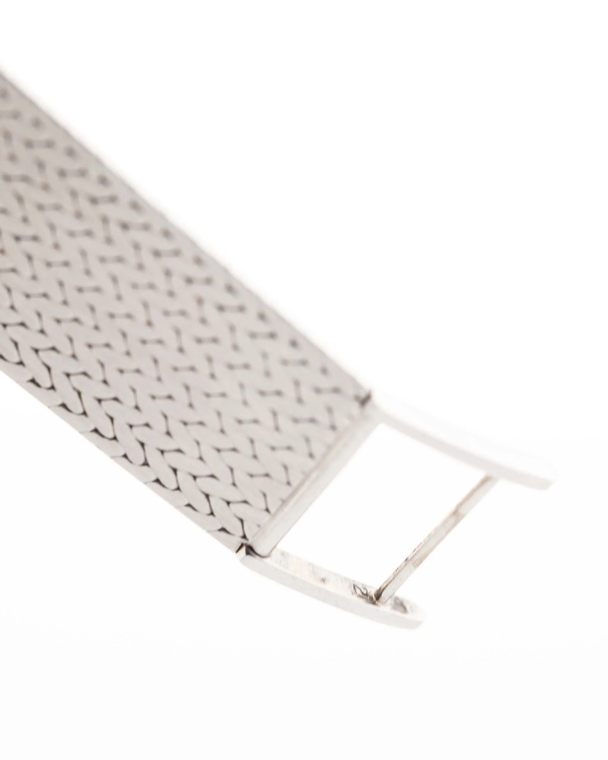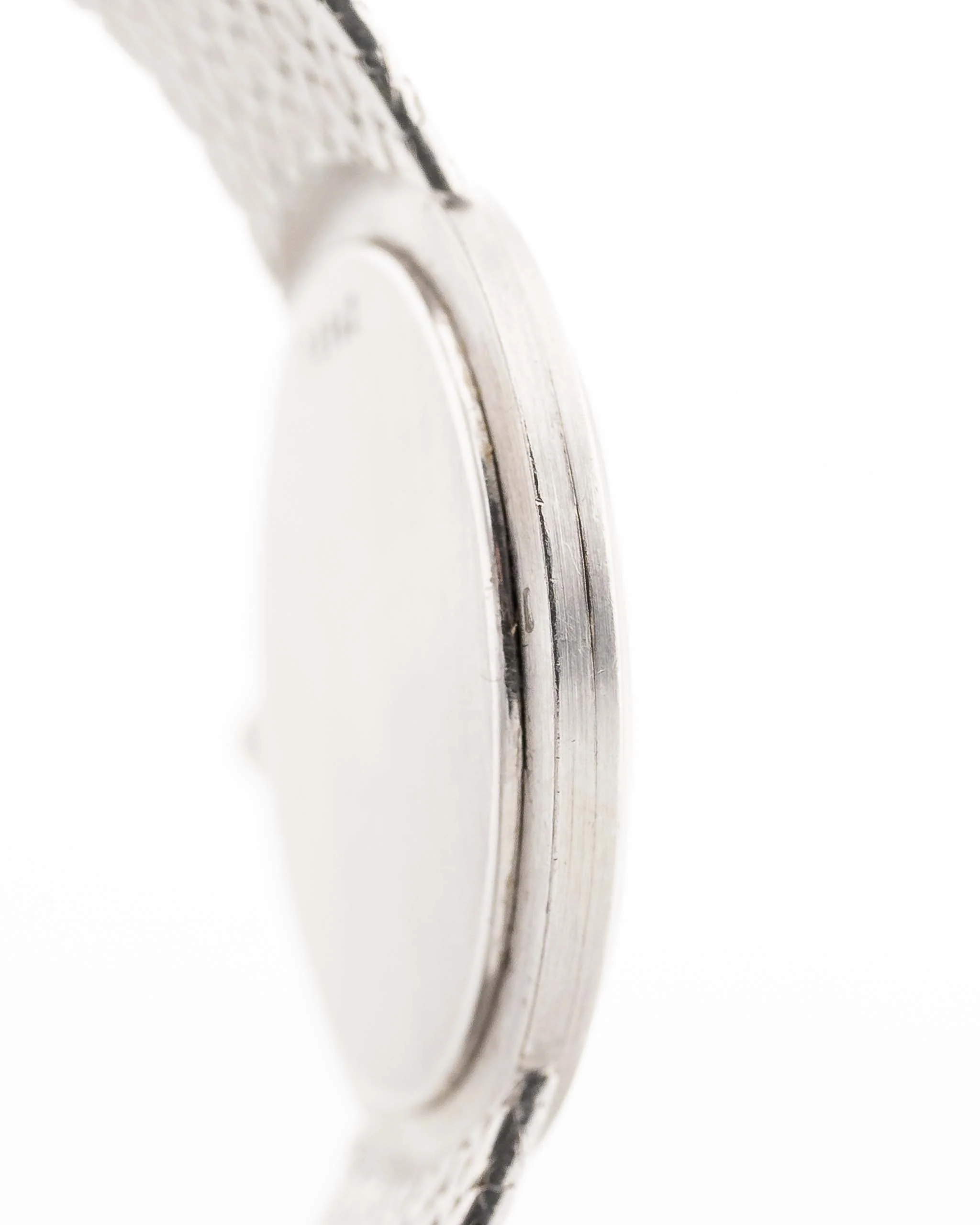 The 18k white gold case measuring 31 mm in diameter is in sharp condition and refined with a very unique 18k white gold case and bracelet. The icing on the cake is the clean silver colored dial in great condition with stick hands and hour markers.