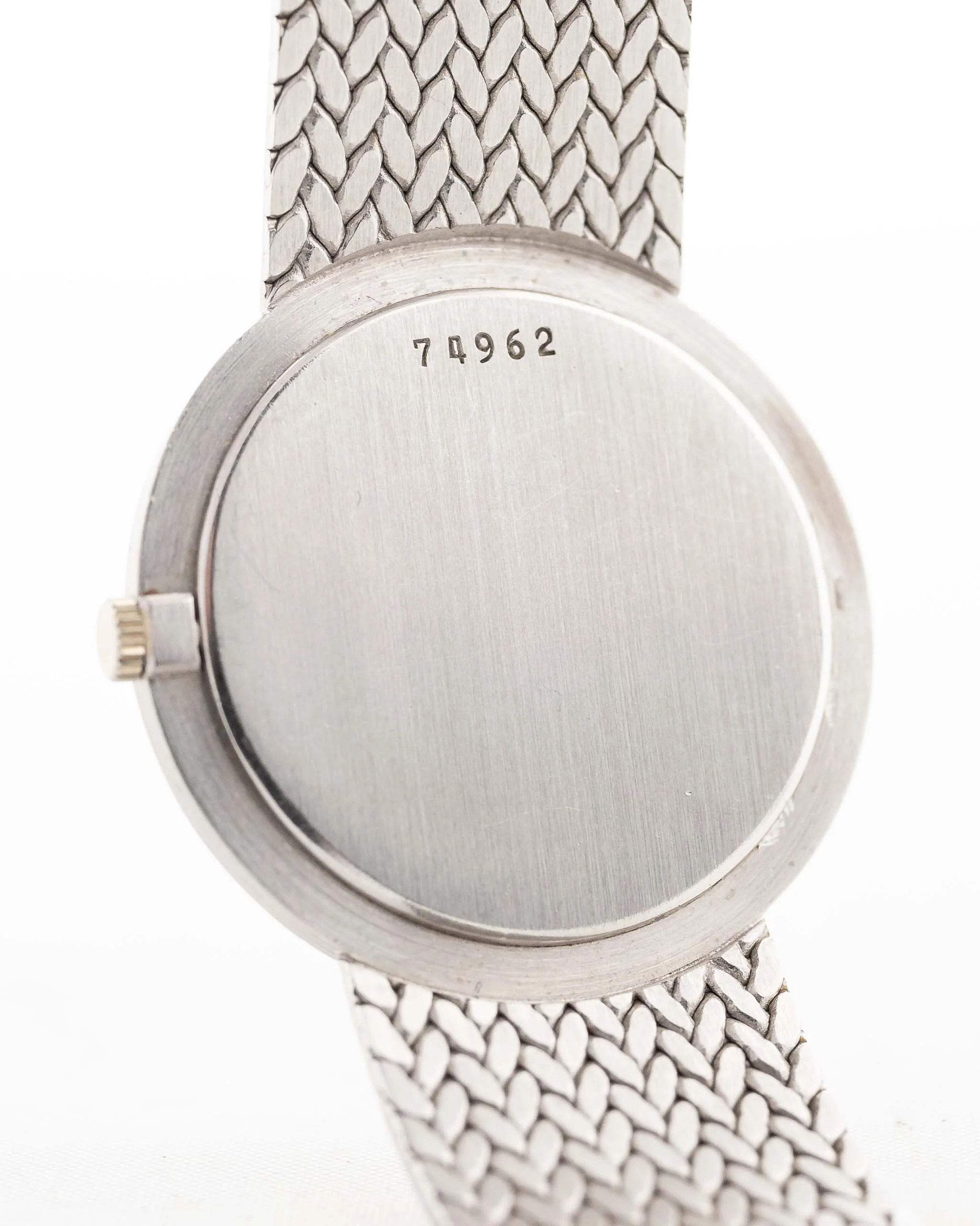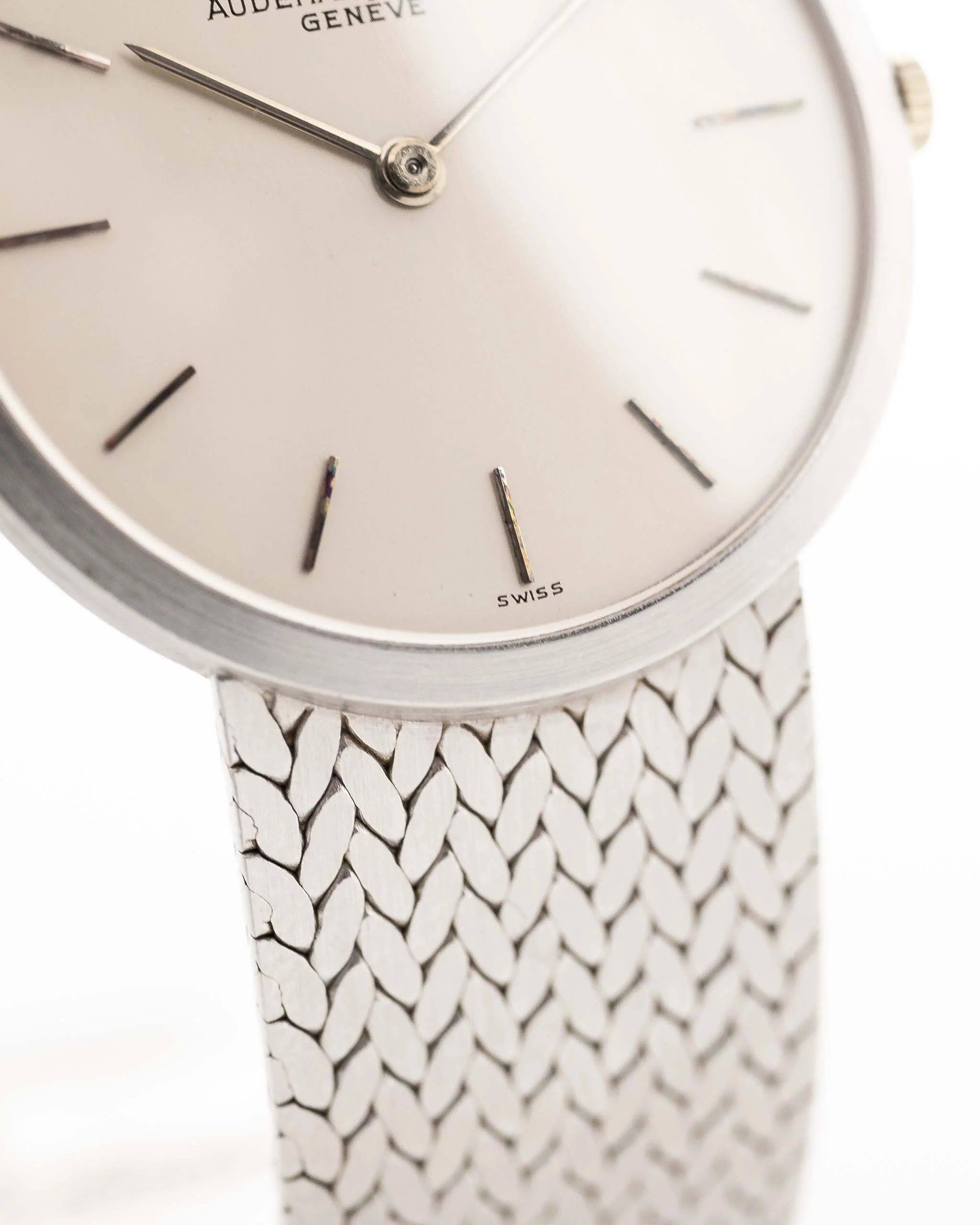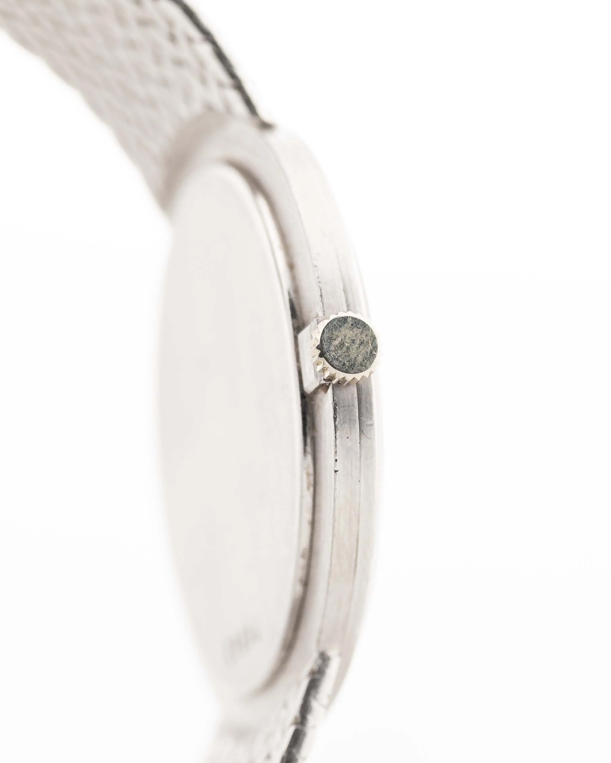 The 18k white gold case measuring 31 mm in diameter is in sharp condition and refined with a very unique 18k white gold case and bracelet. The icing on the cake is the clean silver colored dial in great condition with stick hands and hour markers.