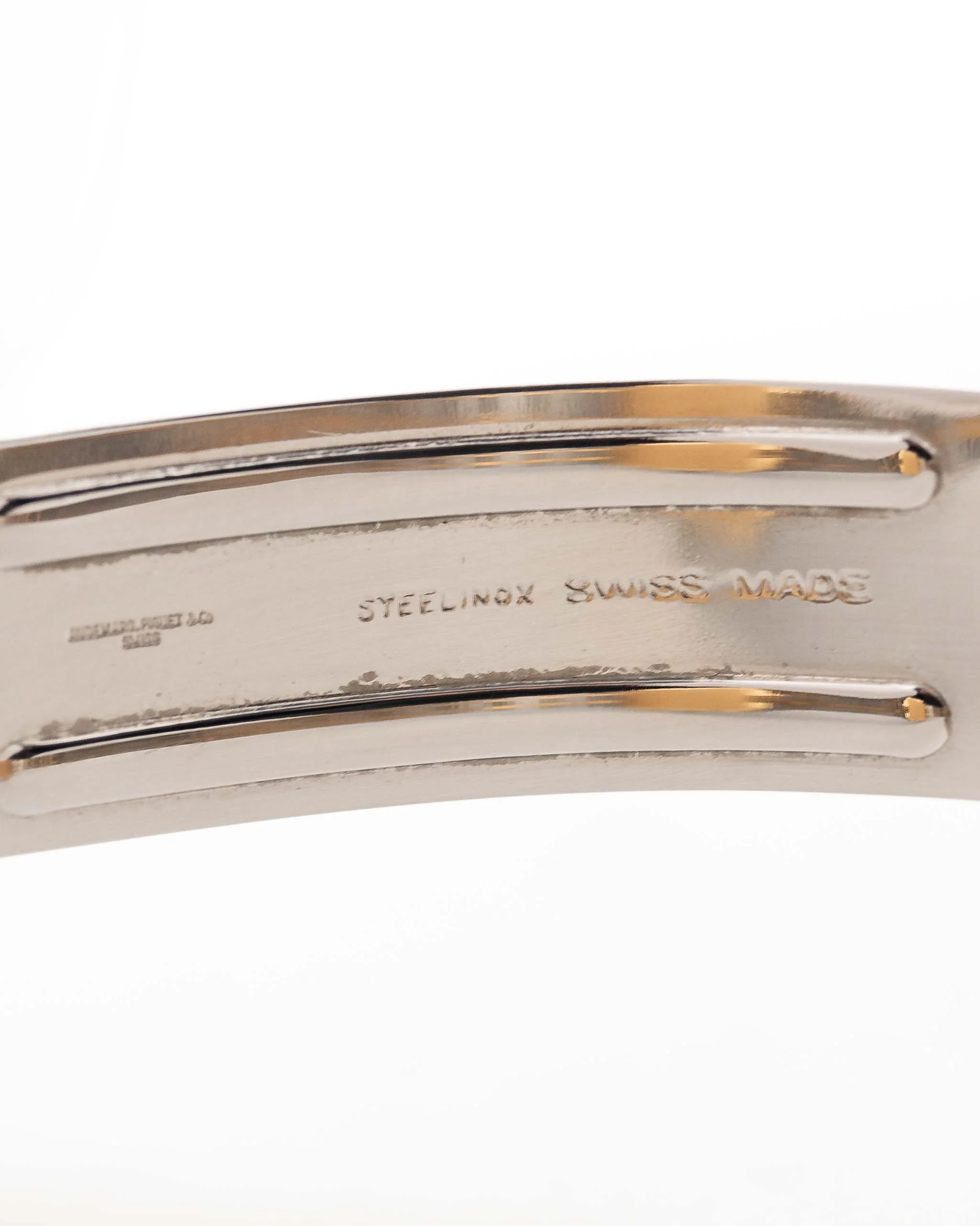 Our particular Reference 6005 SA features a 32mm two tone steel case with a sapphire crystal, an unsigned pusher crown, a gold bezel, and a grey colored tapisserie dial with a yellow gold 'stick' handset and hour markers.
