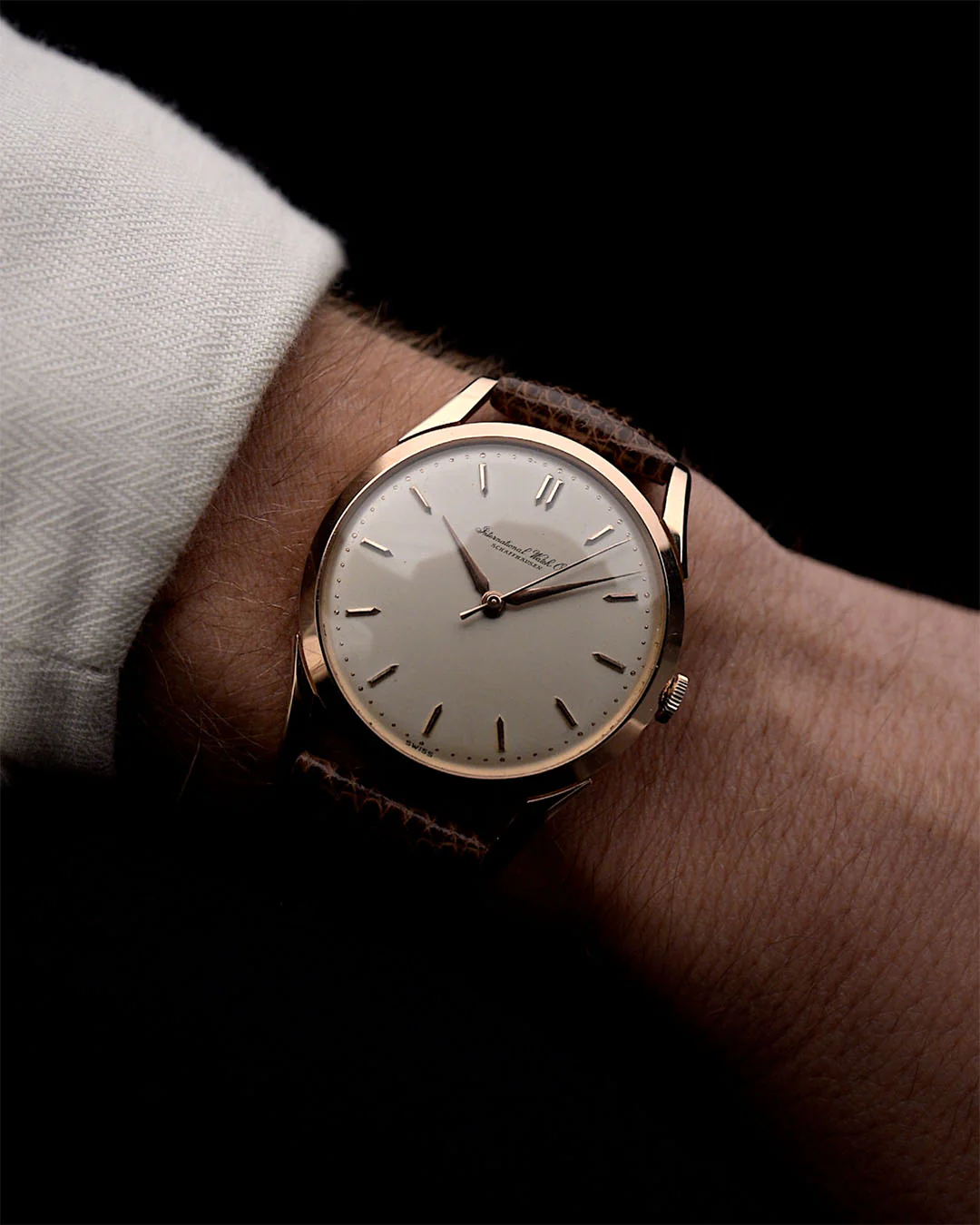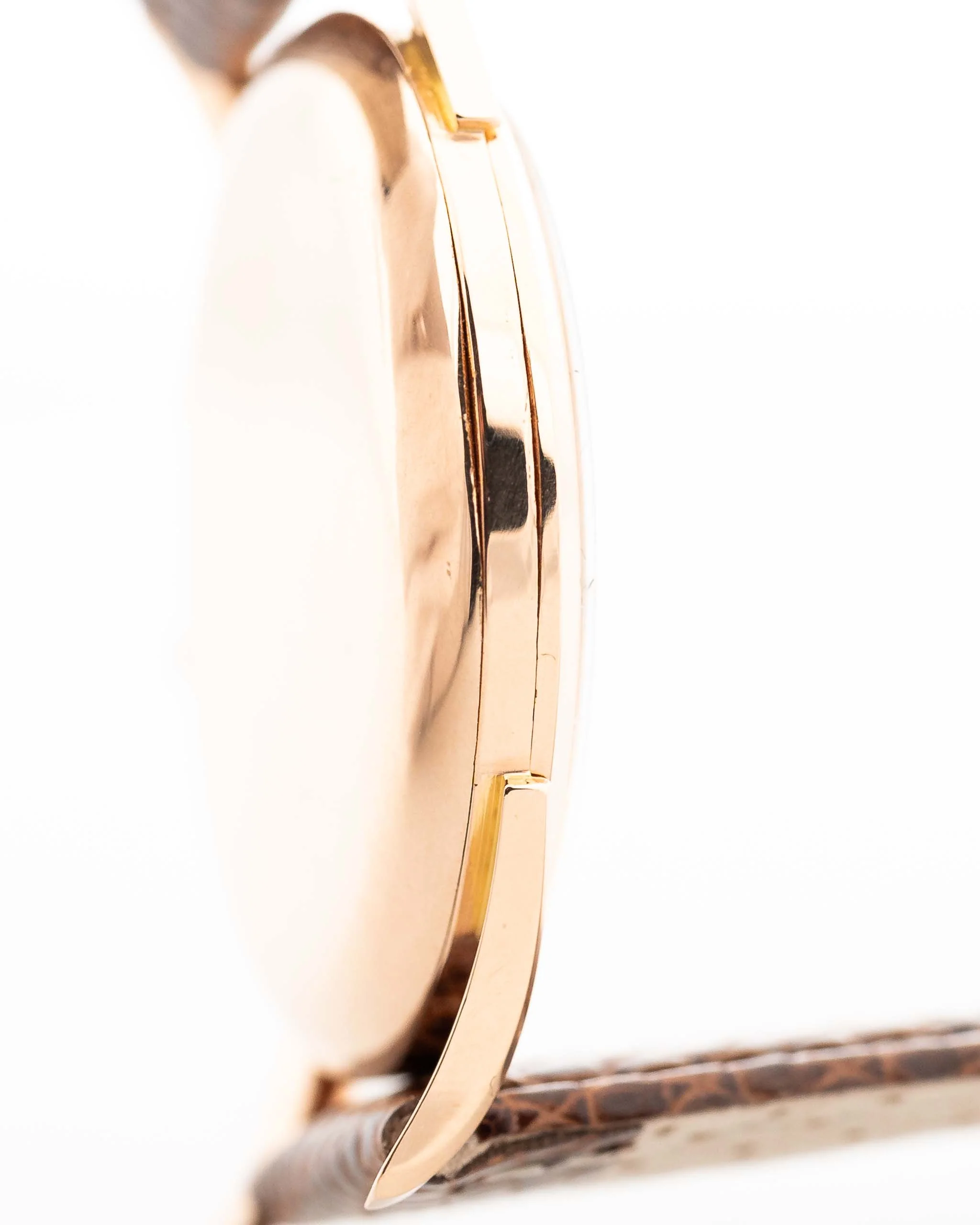 IWC has produced a very wide variety of wristwatches from an early time ranging from dress watches to aviation watches. This example, in 18k rose gold with it's white/silver dial would remain a constant in anyone's collections. Especially as it comes with these beautiful huge slight down turned lugs which let it appear a lot bigger than 36mm.