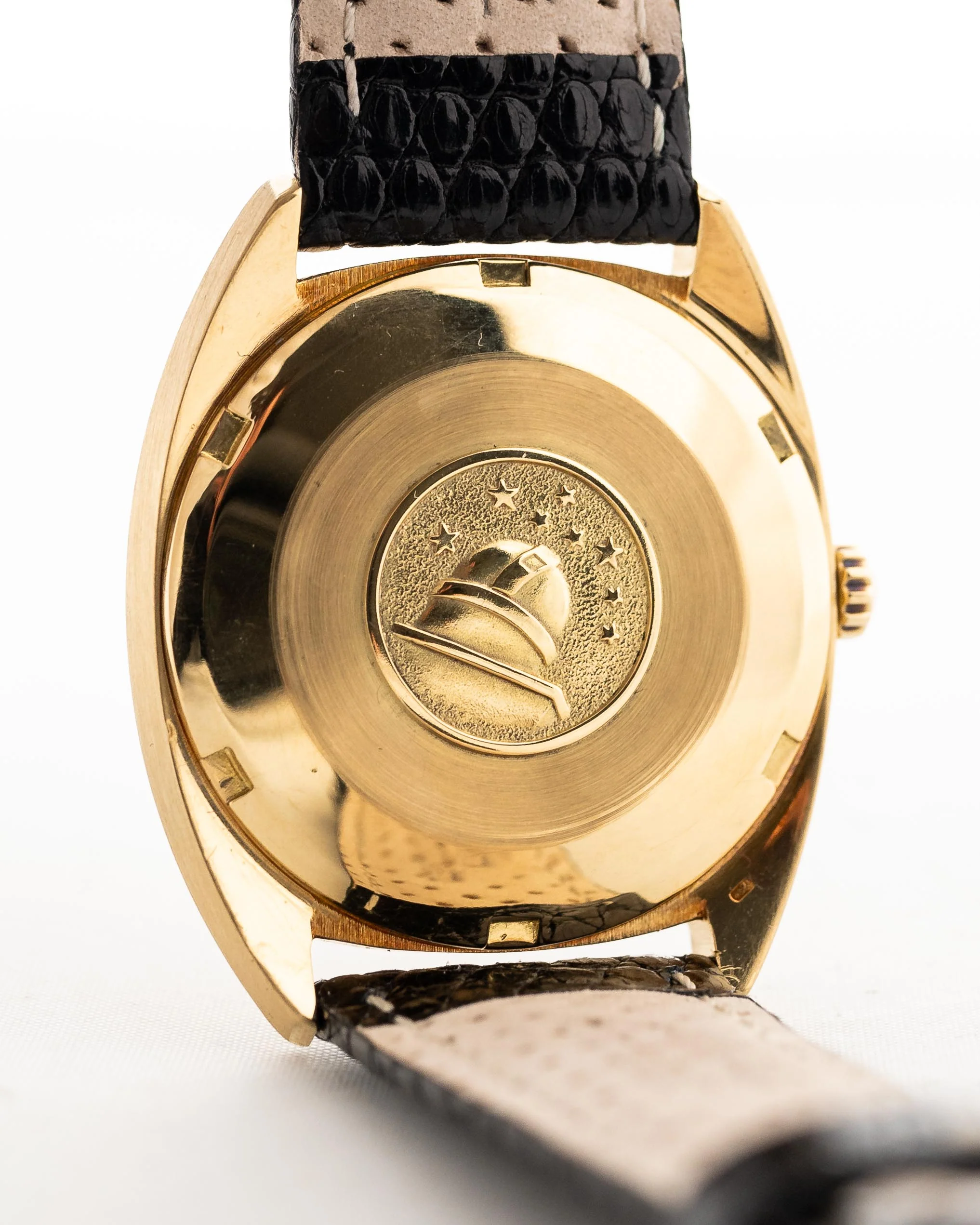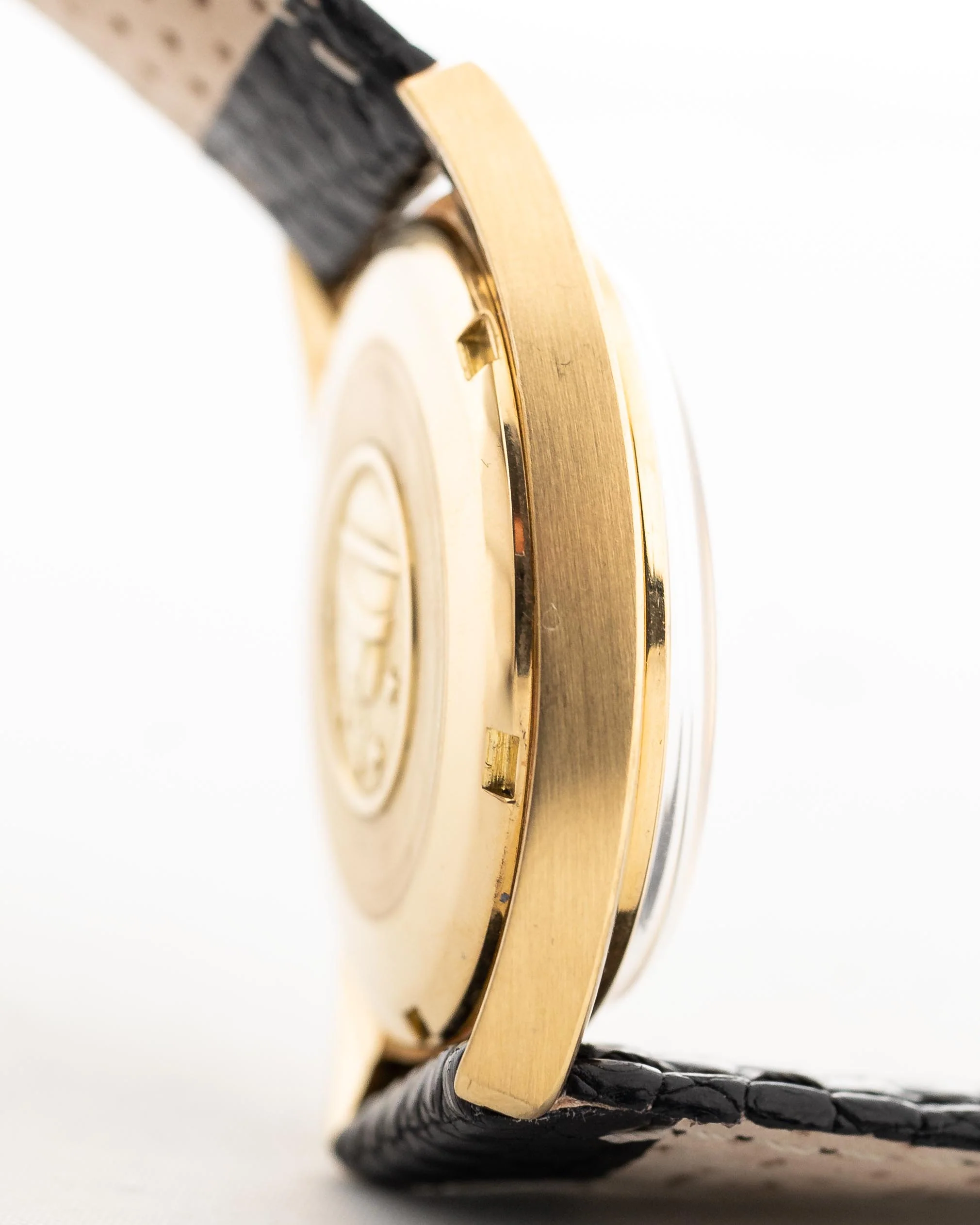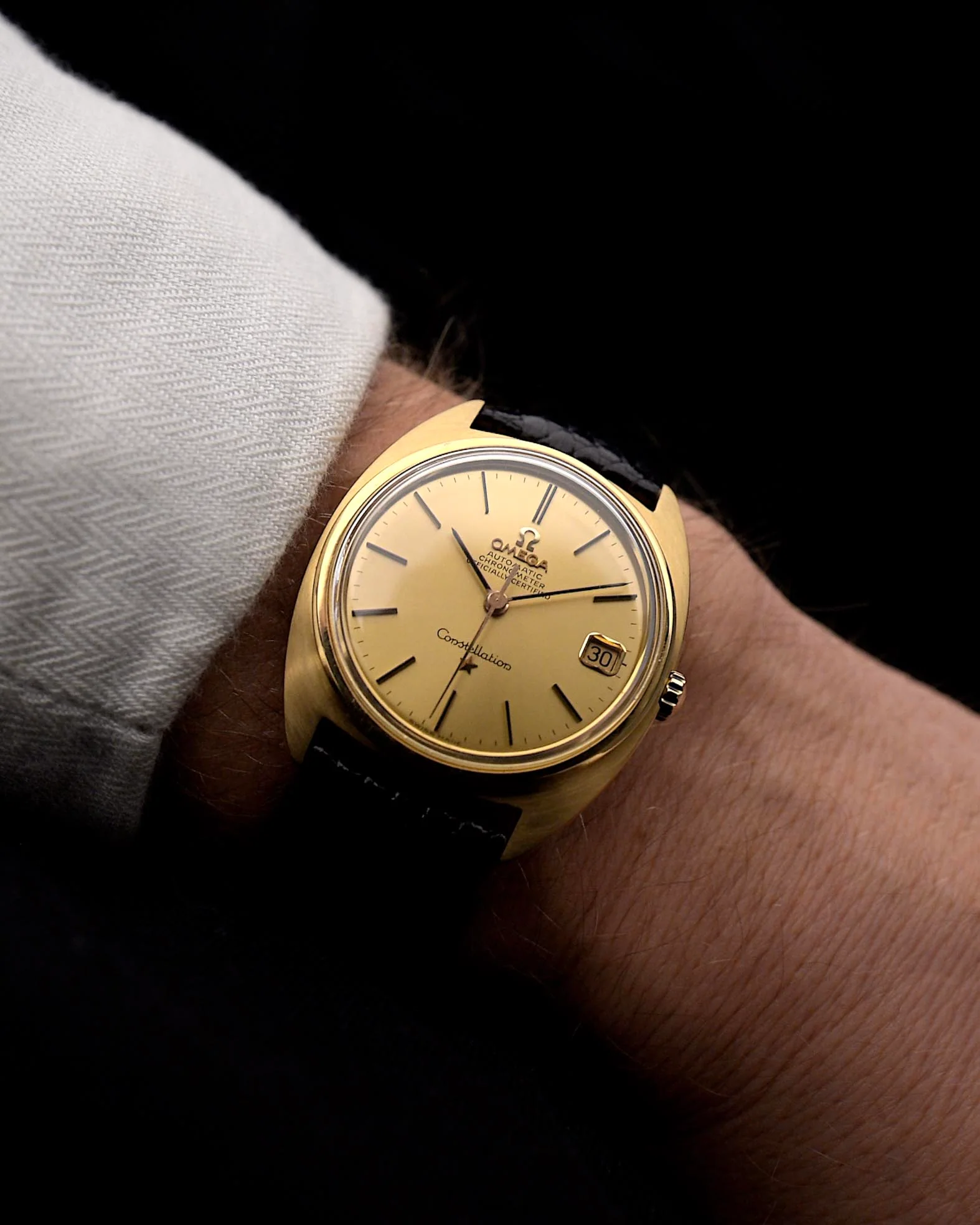 his compact and beautiful Omega Constellation Date automatic chronometer has everything you want in a dress watch: 35 mm 18k yellow gold C-Shape case, center second, a very beautiful golden colored dial and rare black stick hour markers and handset. First released in 1952, the Constellation was Omega's answer to the Rolex Datejust.