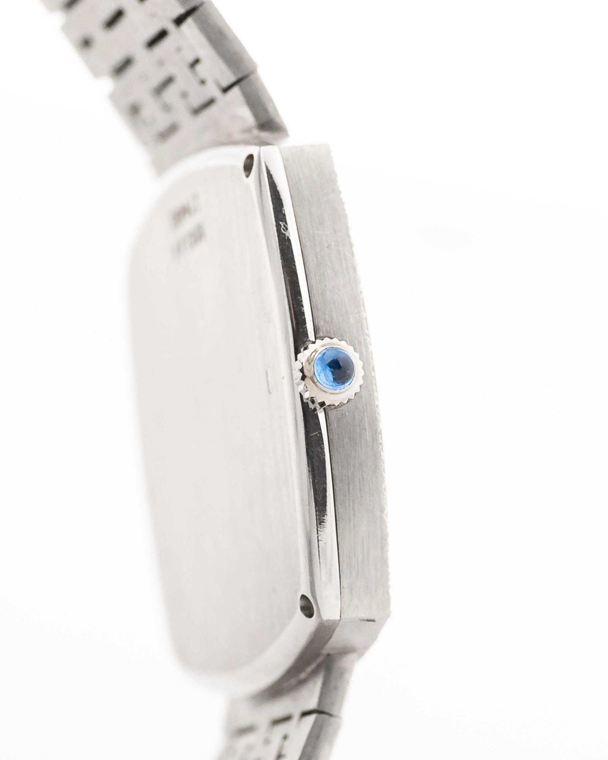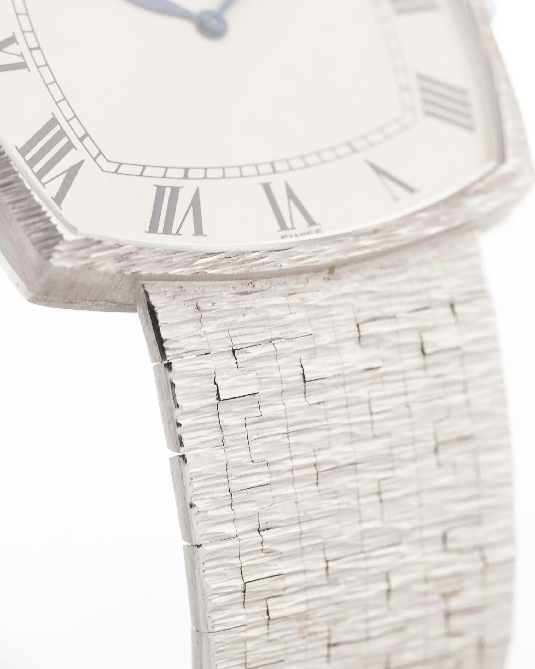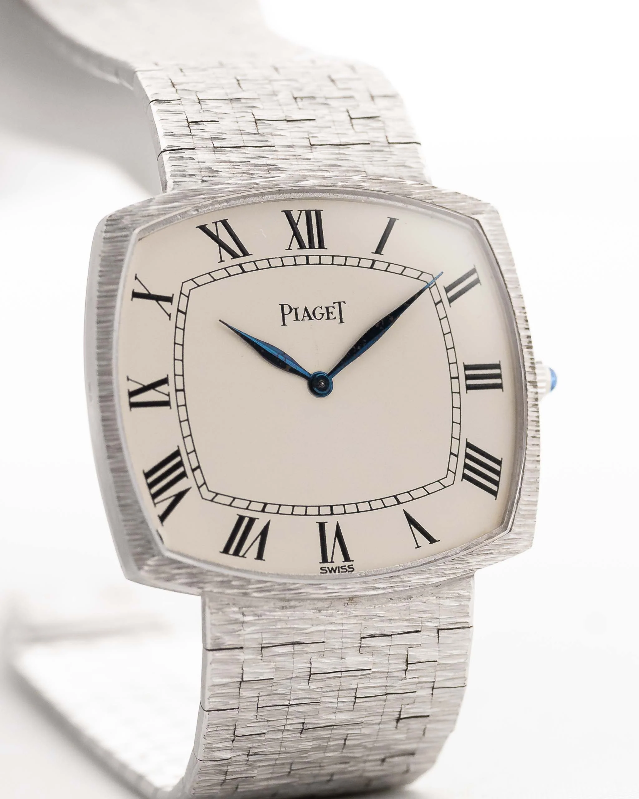 Our piece comes in fantastic condition with a stunning integrated 18k white gold Piaget bracelet, the white dial with roman numerals and blueish leaf hands is in flawless condition. The overall appearance with the square case shape with the no lug design is a piece of art.