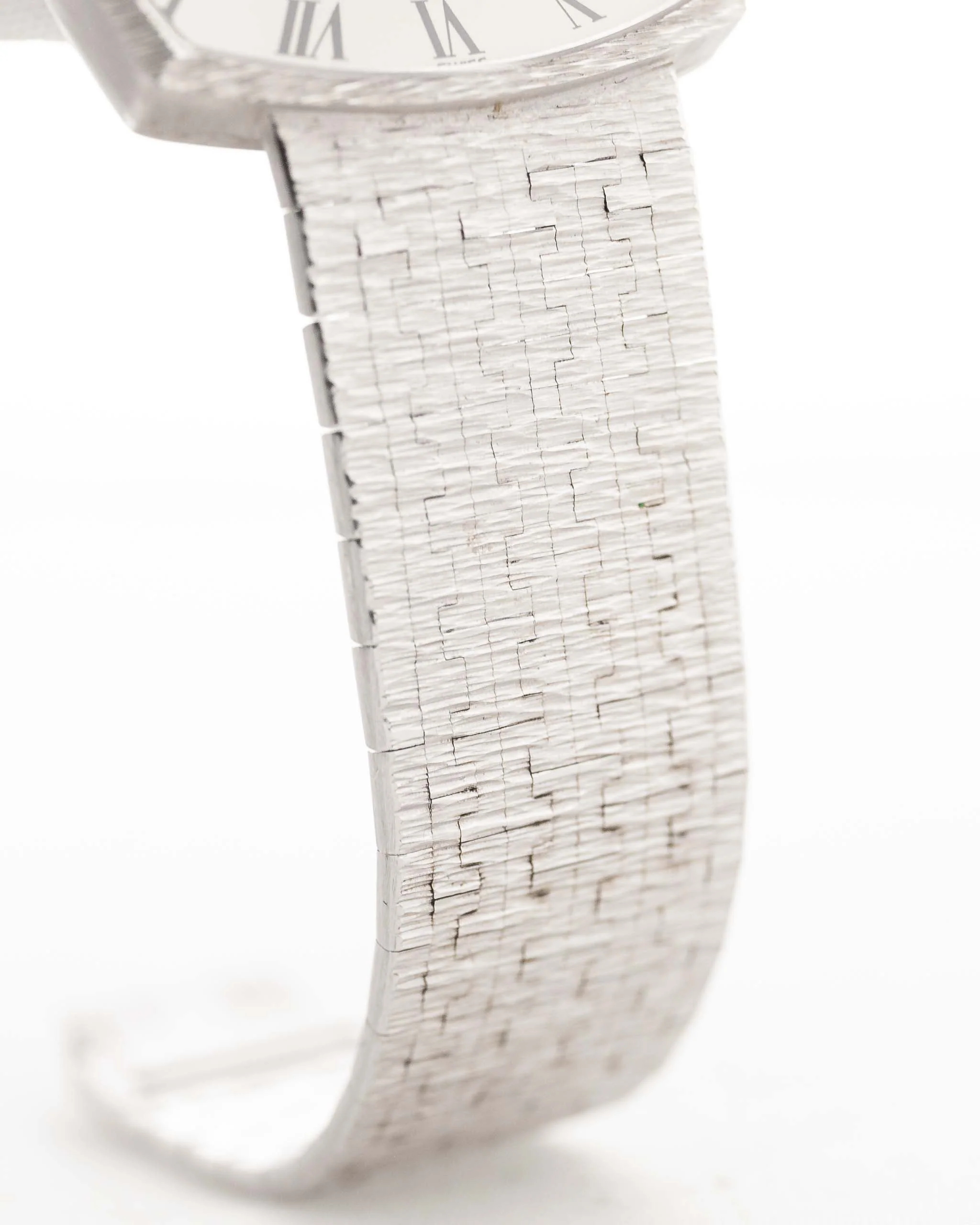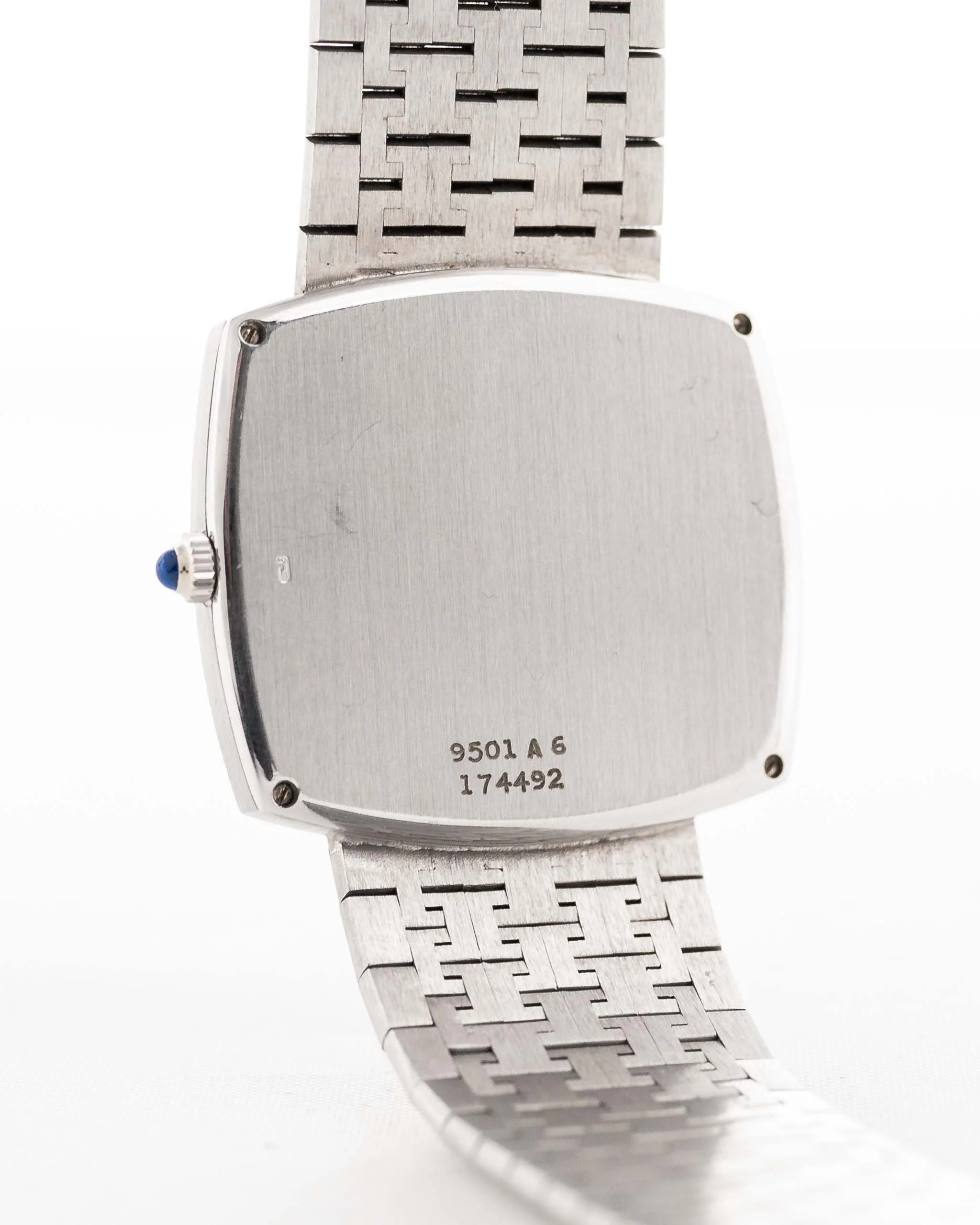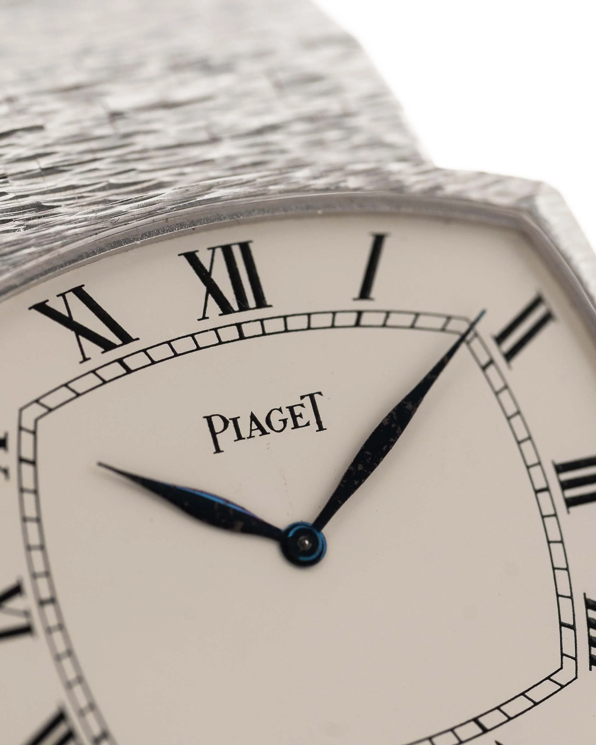 Our piece comes in fantastic condition with a stunning integrated 18k white gold Piaget bracelet, the white dial with roman numerals and blueish leaf hands is in flawless condition. The overall appearance with the square case shape with the no lug design is a piece of art.