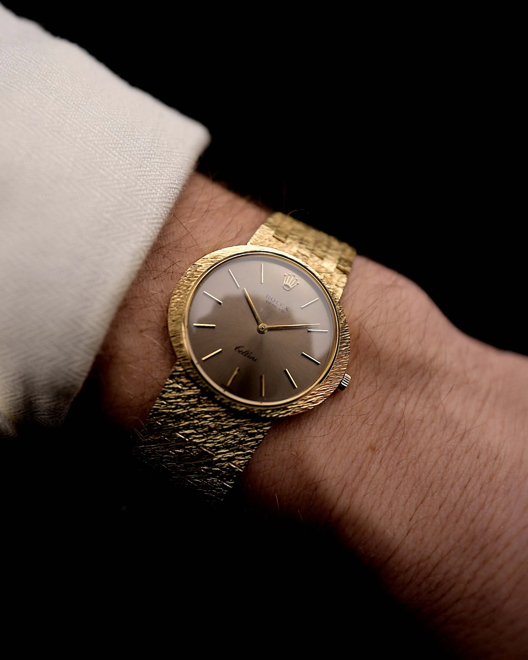Rolex is well-known for its legendary sport models. This Rolex Geneve Cellini showcases the dressier side of Rolex and is fitted in a 14k-yellow-gold Ellipse shaped case, which is an unusual case shape for Rolex.