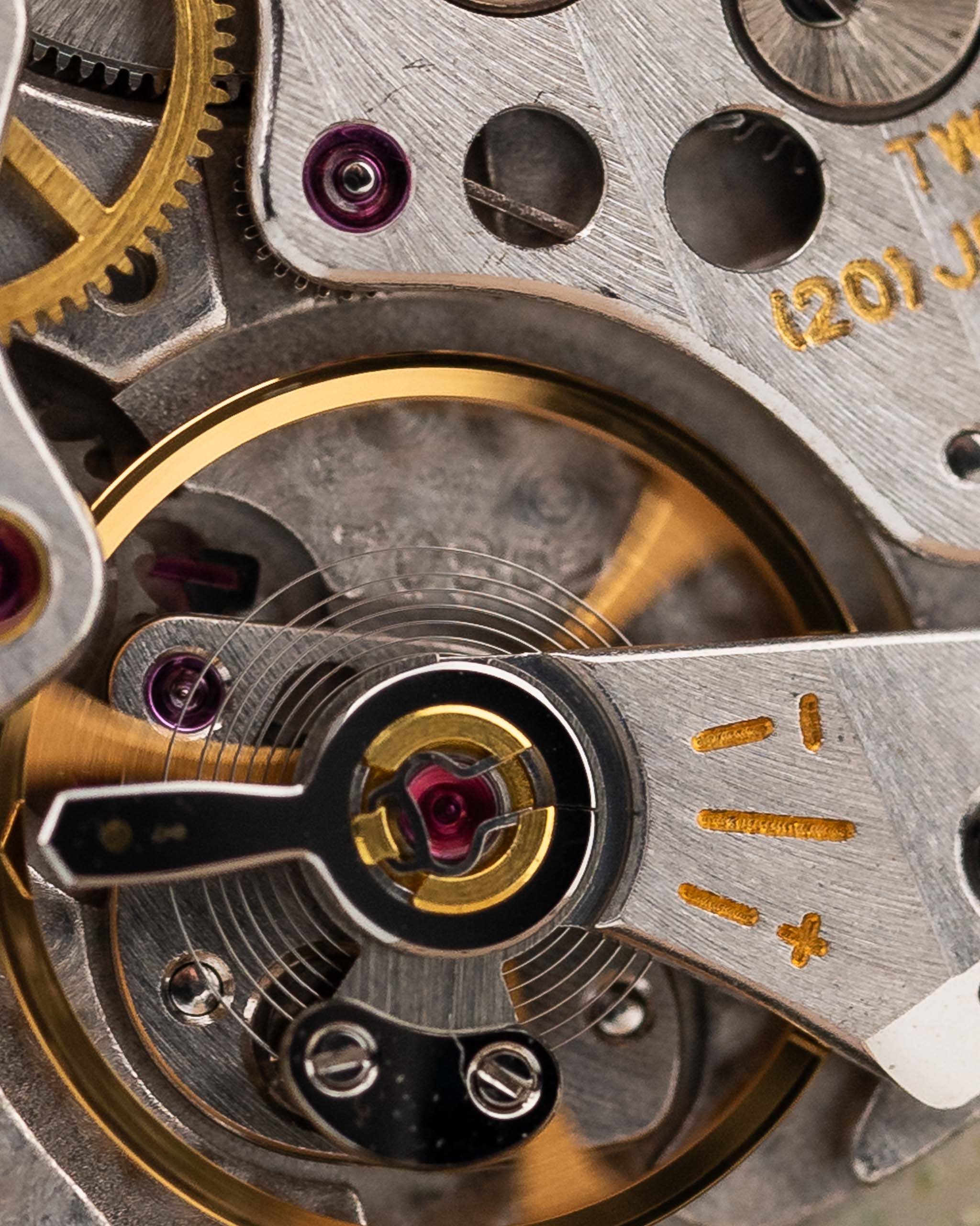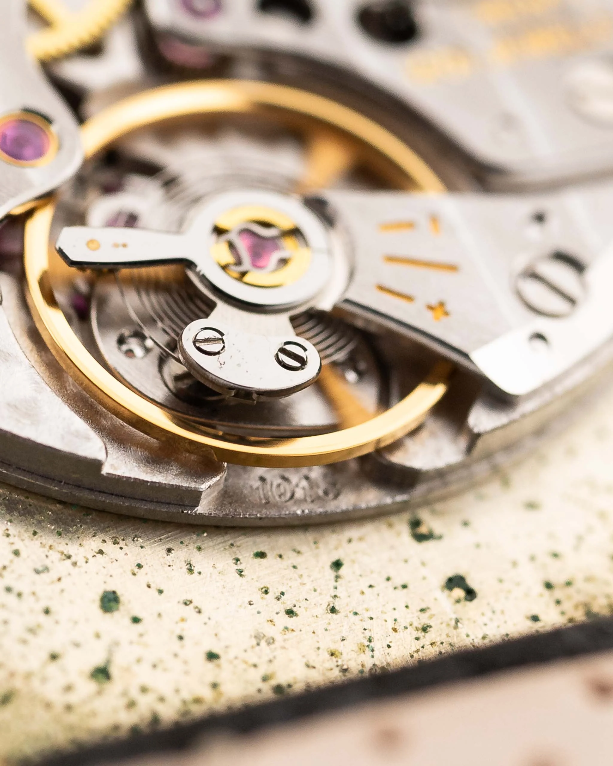 This particular piece is notable for its vertical brushed golden Sigma dial, which indicates that the stick hands and hour markers are made of 18k gold too. It comes in fantastic overall condition.