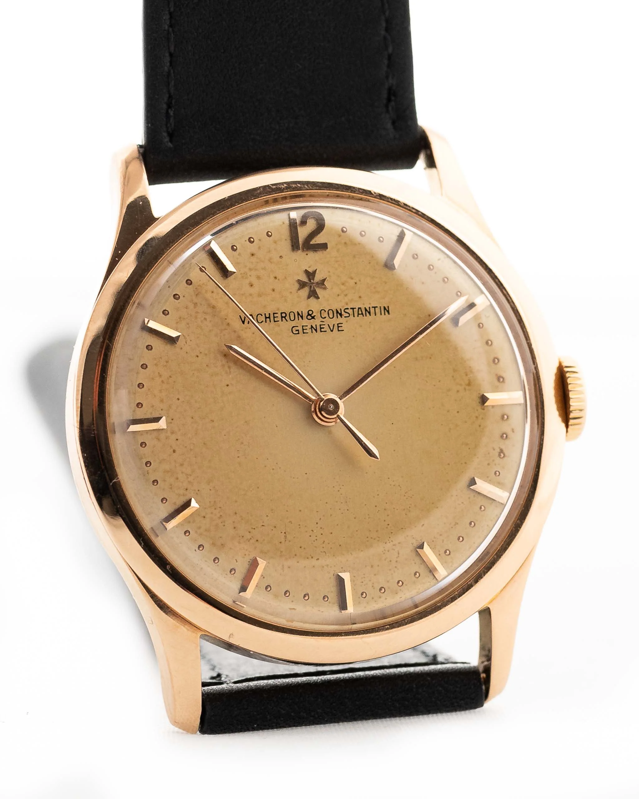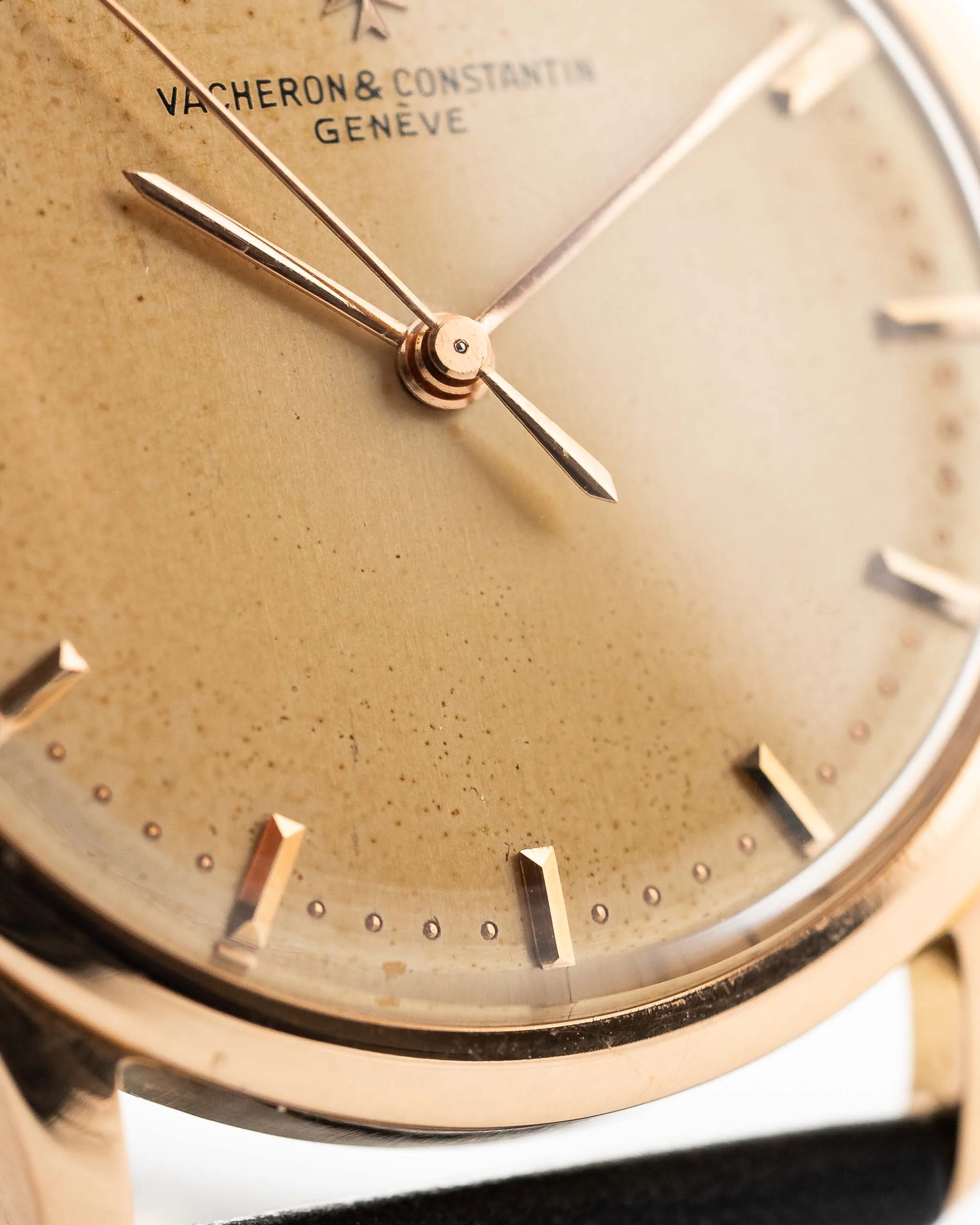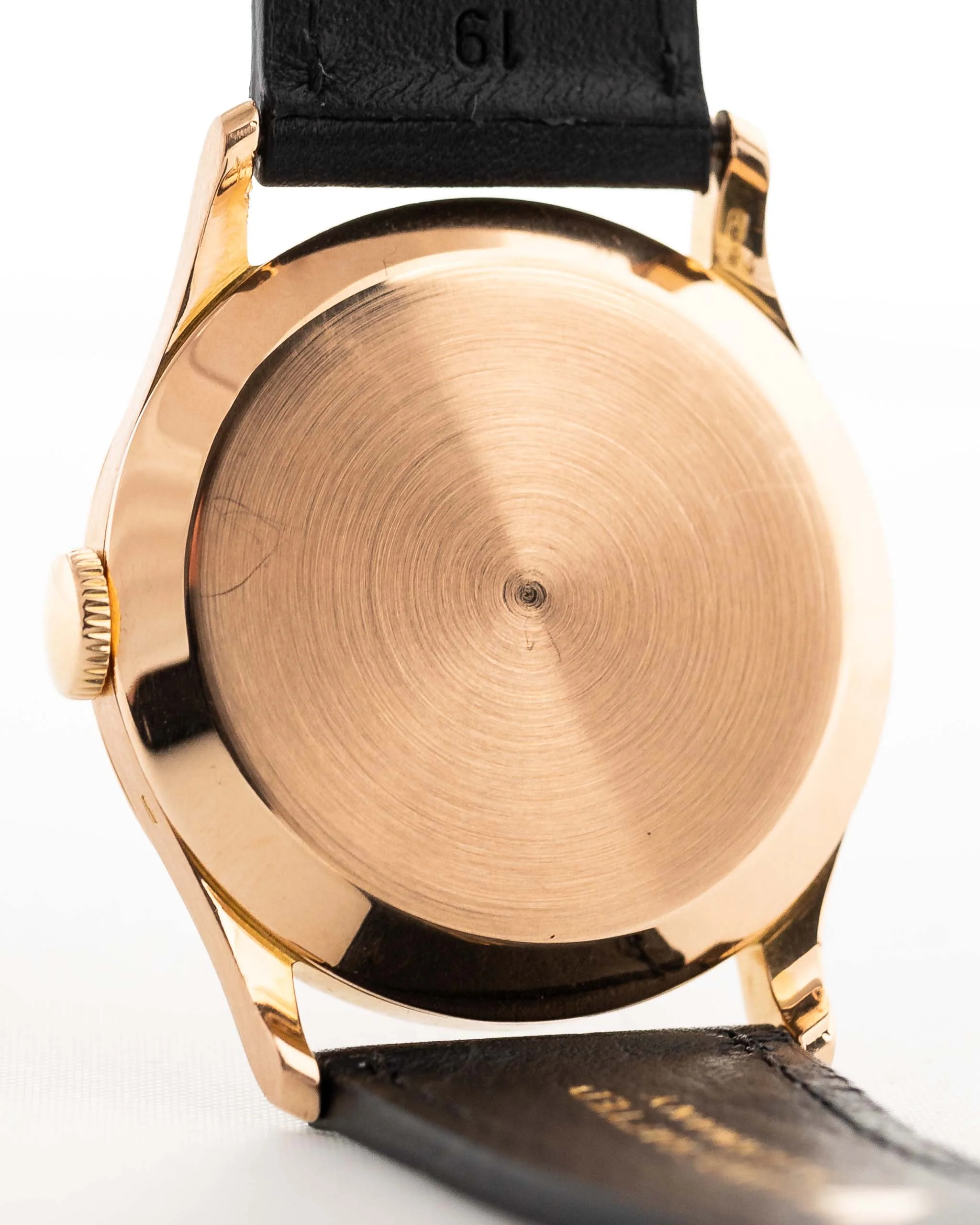 Here we have a beautifully finished very rare Vacheron Constantin dress watch from the 1950s with stunning 18k rose gold Antoine Gerlach SA case and an elegant champagne dial with major twelve layout.