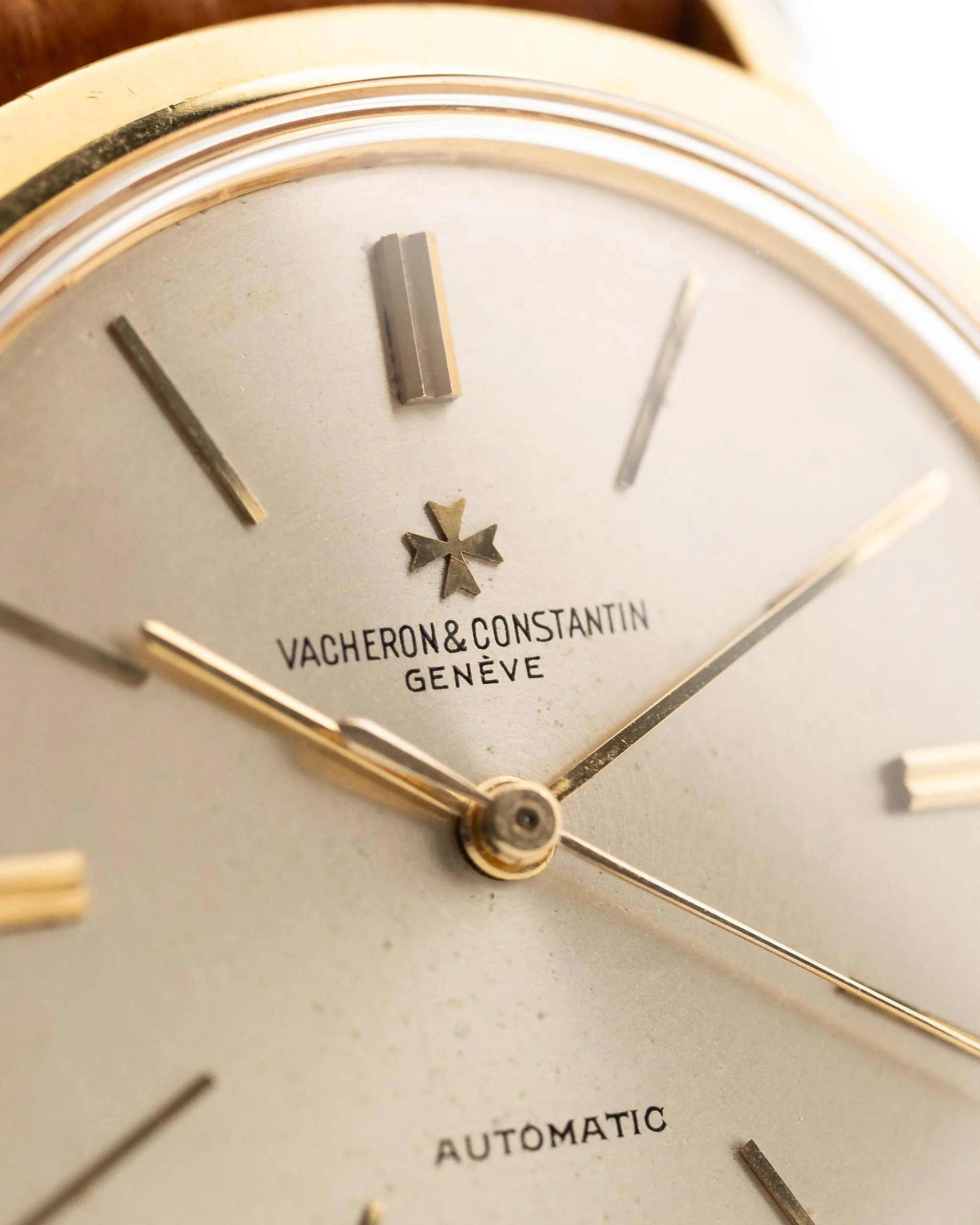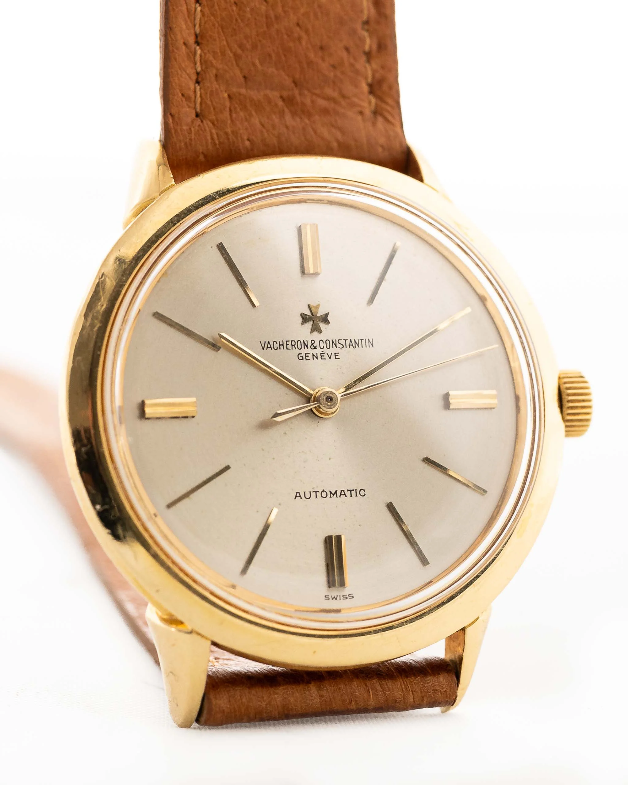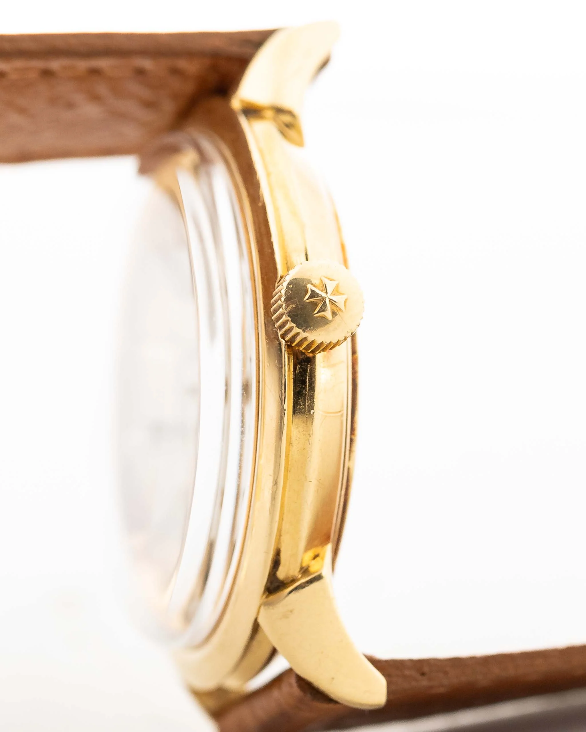 Here we have a beautiful example of a time only, 35,5 mm yellow gold Vacheron Constantin ref. 6592 automatic from 1960s. This piece has a silver dial with applied yellow gold hour markers and stick hands. The attention to detail of the hour markers and elegance of the clean dial is rarely seen done so well. This is a classic example of a VC dress watch with simple indicating hours, minutes and seconds and a 18k Gerlach case.