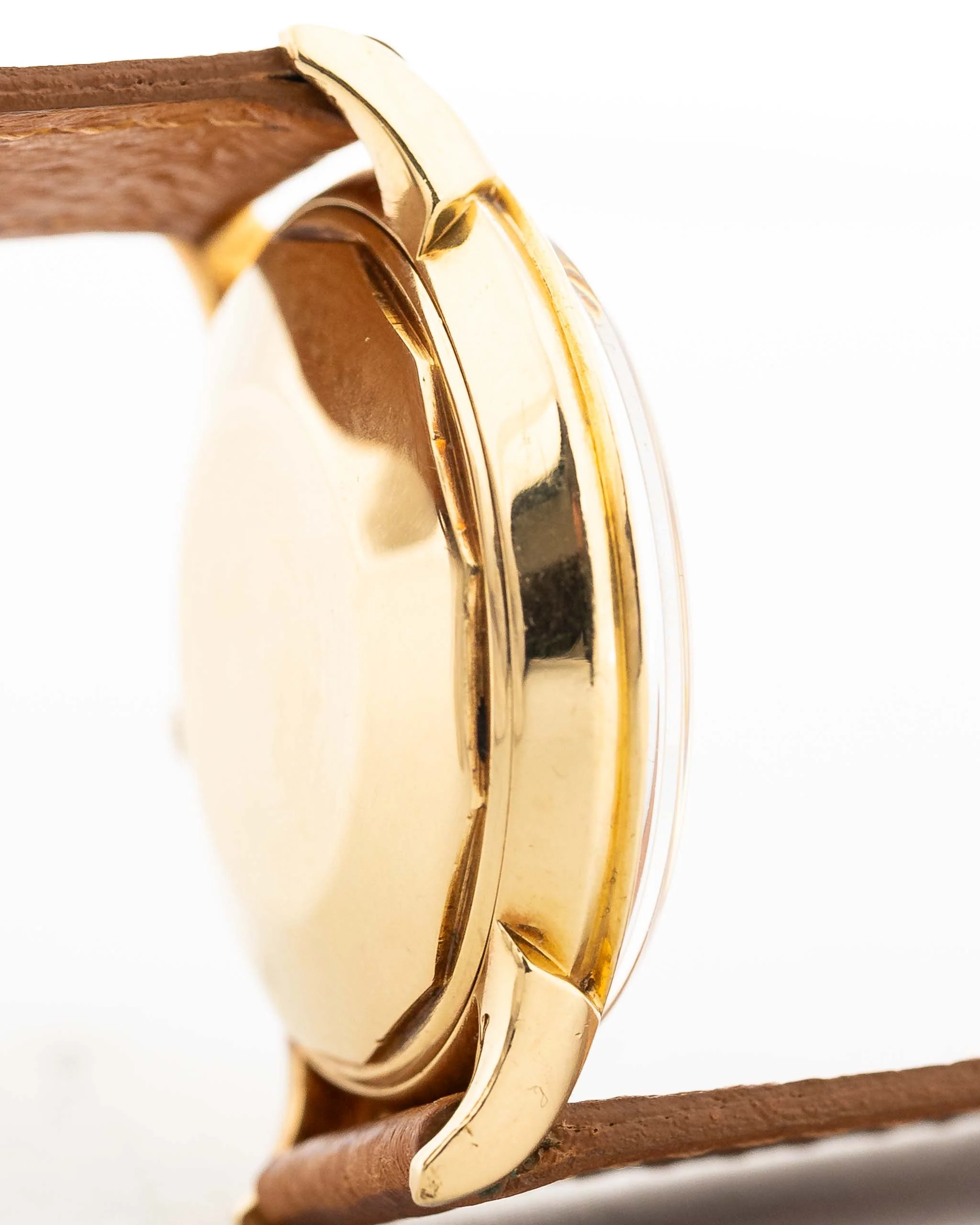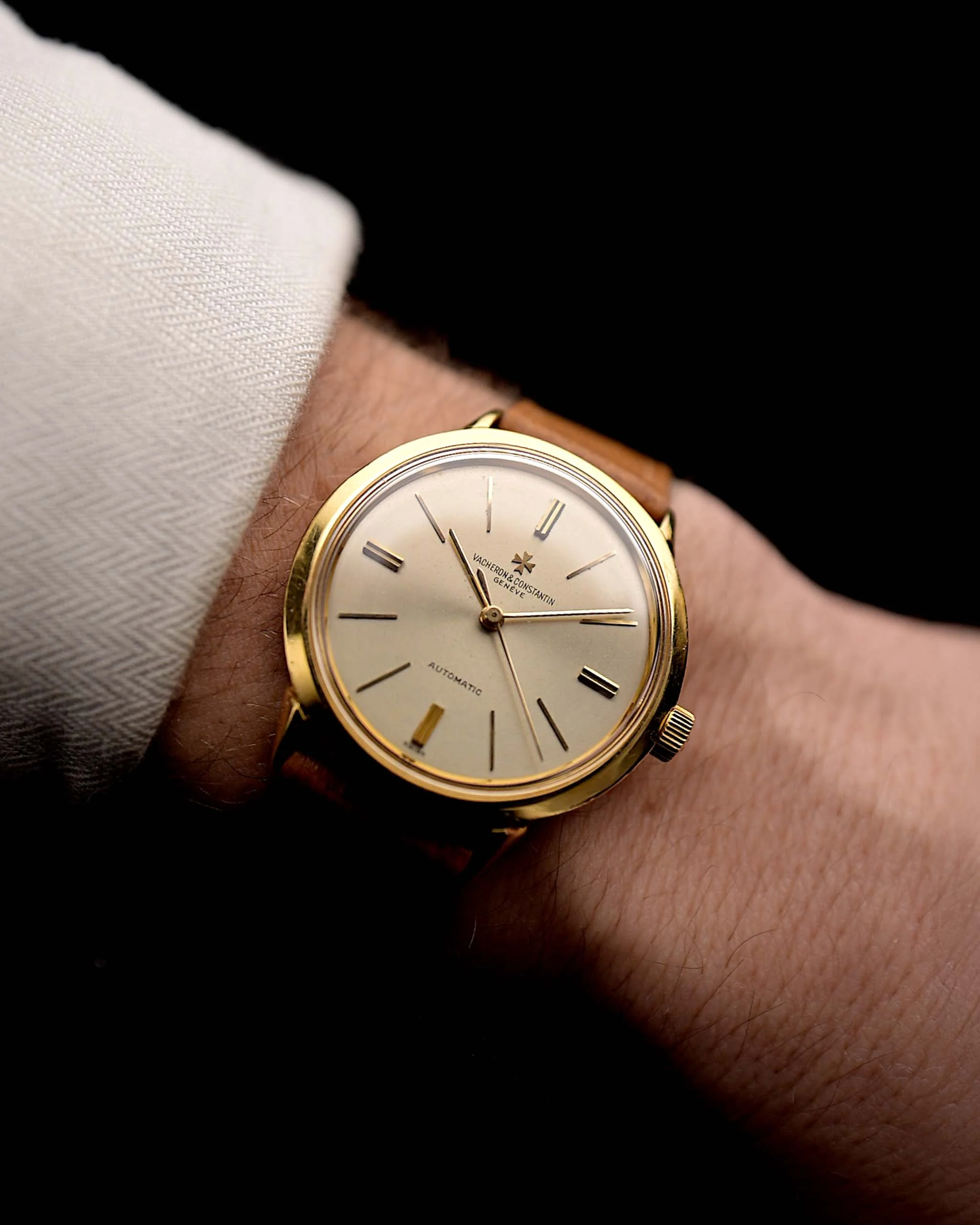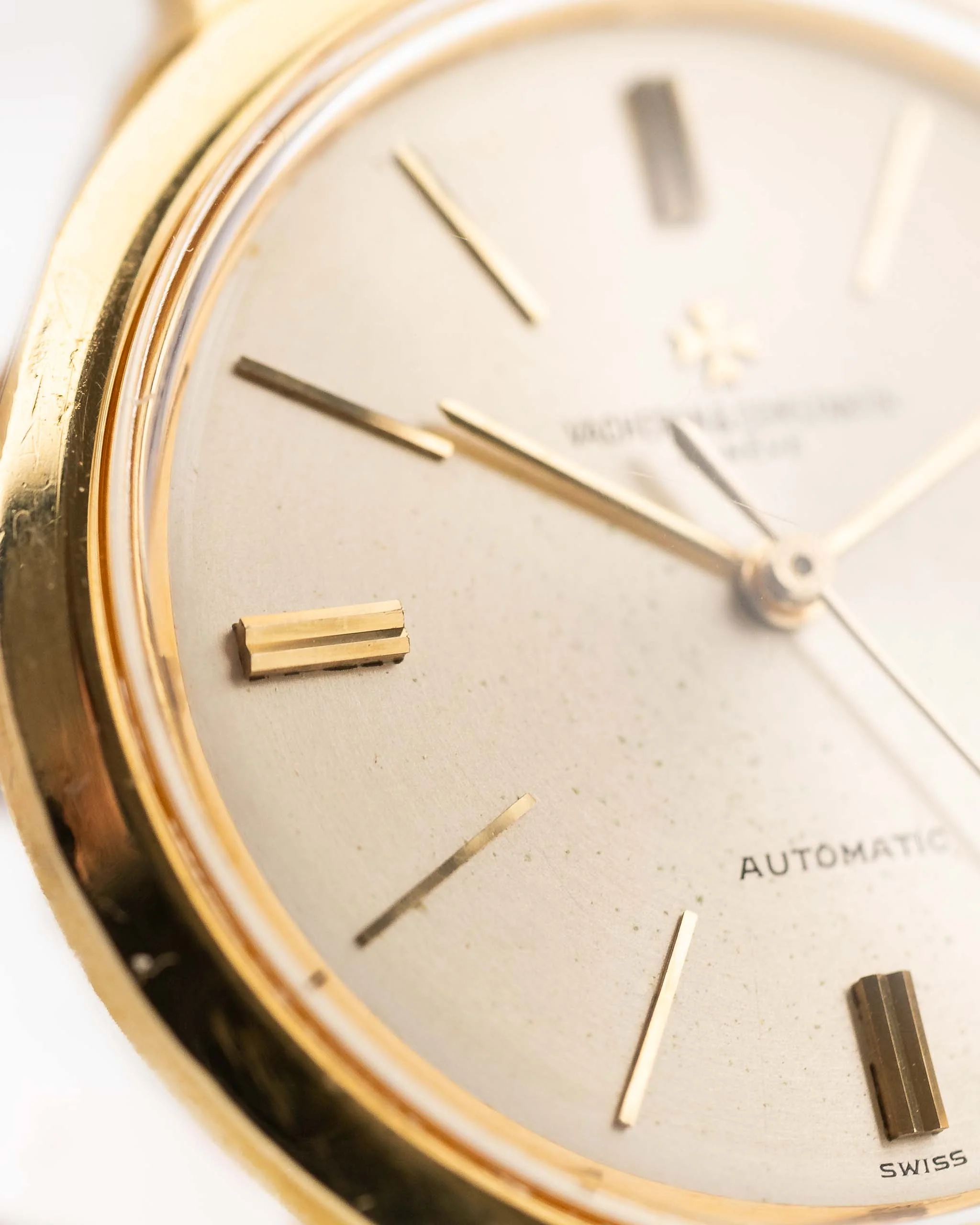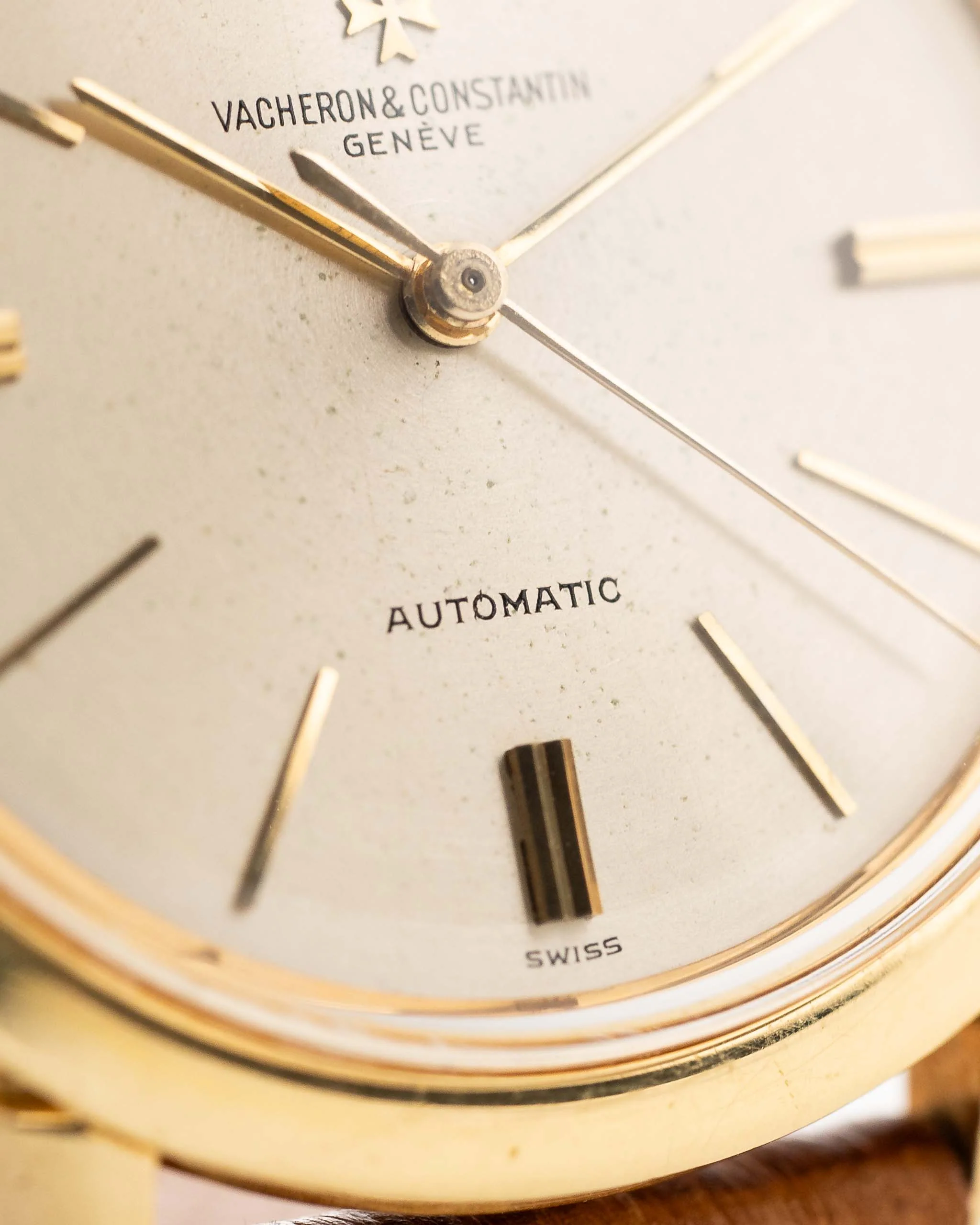 Here we have a beautiful example of a time only, 35,5 mm yellow gold Vacheron Constantin ref. 6592 automatic from 1960s. This piece has a silver dial with applied yellow gold hour markers and stick hands. The attention to detail of the hour markers and elegance of the clean dial is rarely seen done so well. This is a classic example of a VC dress watch with simple indicating hours, minutes and seconds and a 18k Gerlach case.